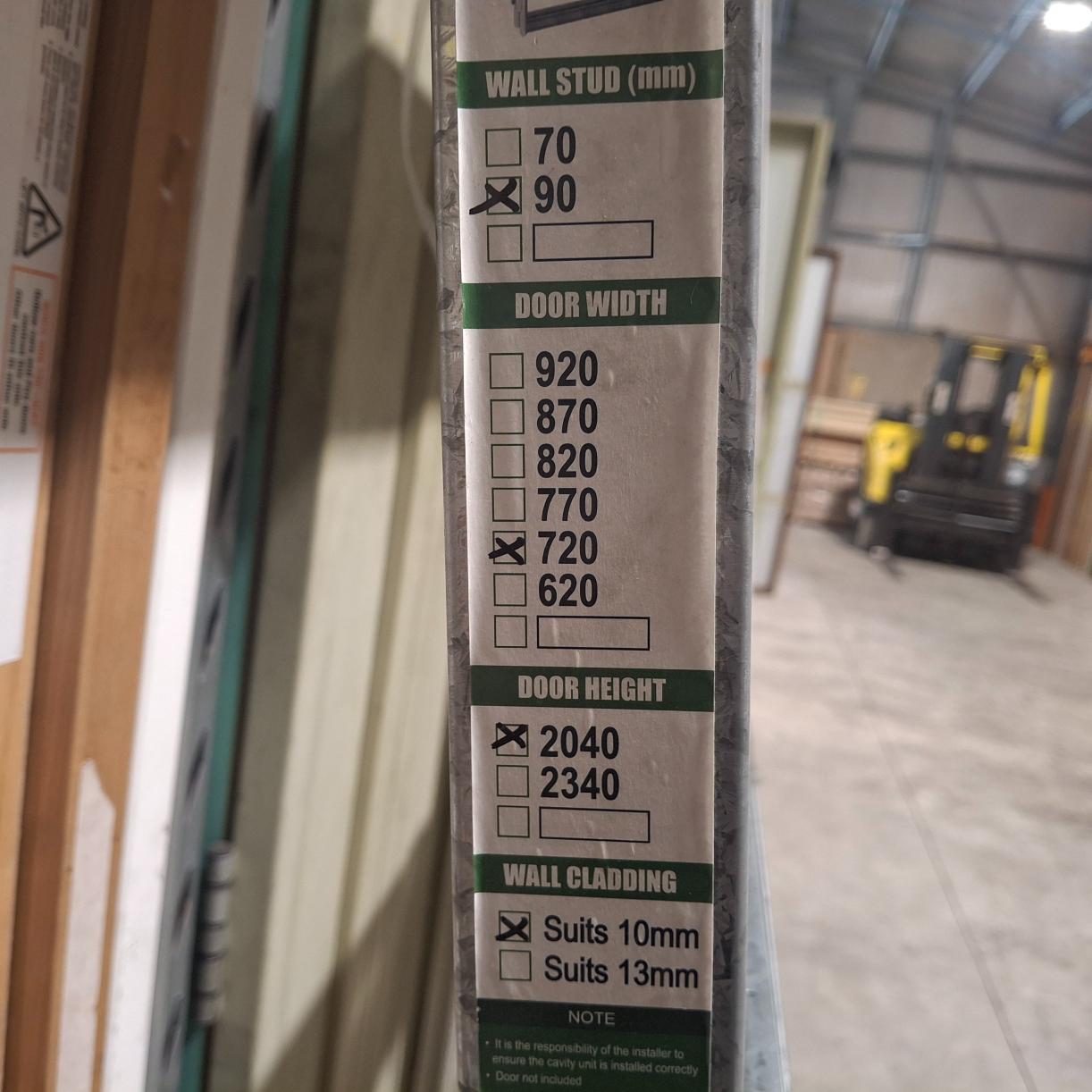 CONDITION SPECIFICS: The condition of this door is a 9/10. The cavity frame is made to suit a 90mm stud, and 10mm cladding. The door has three hinge rebates down one edge of the door, and a cut-out for a handle. Please see additional pictures for reference.
