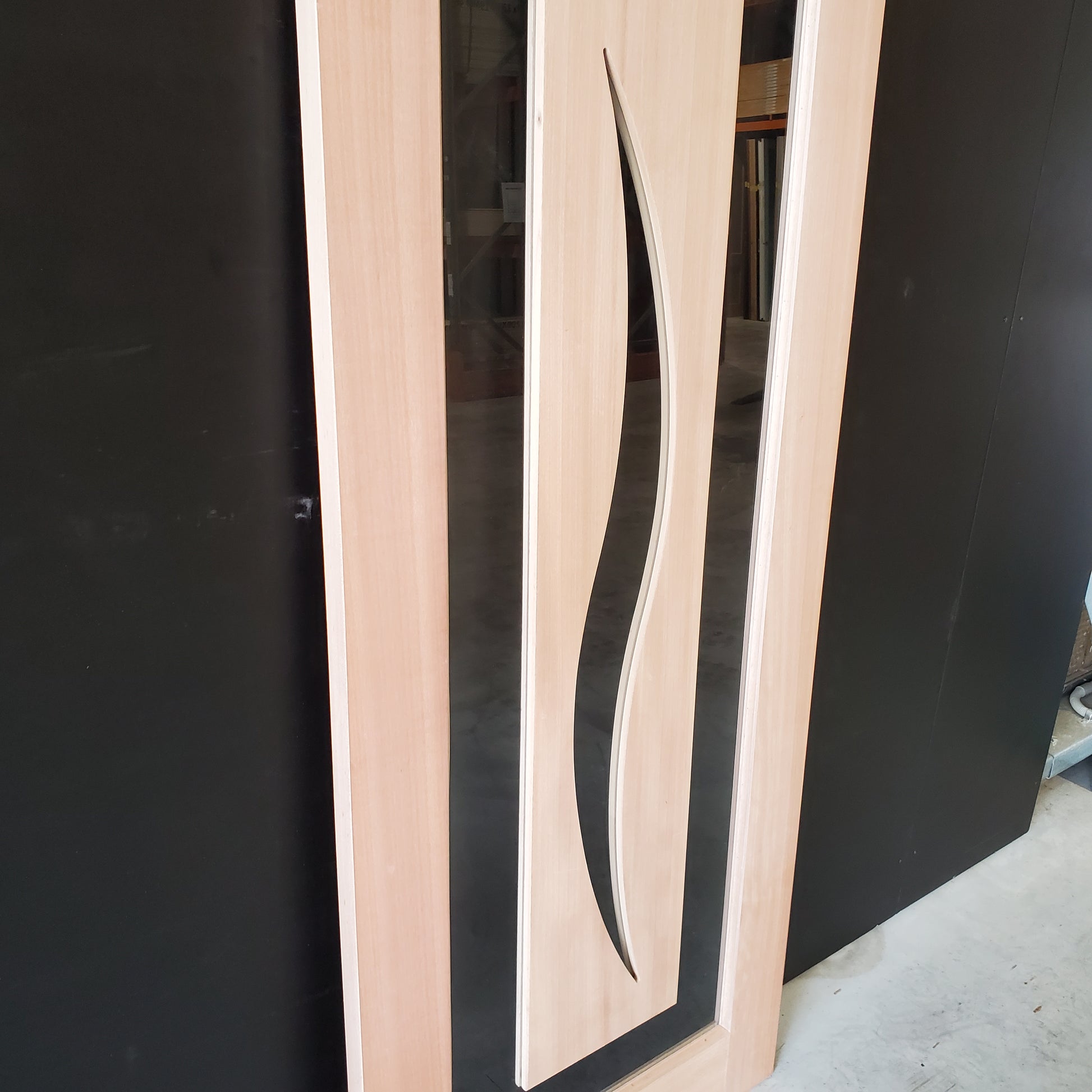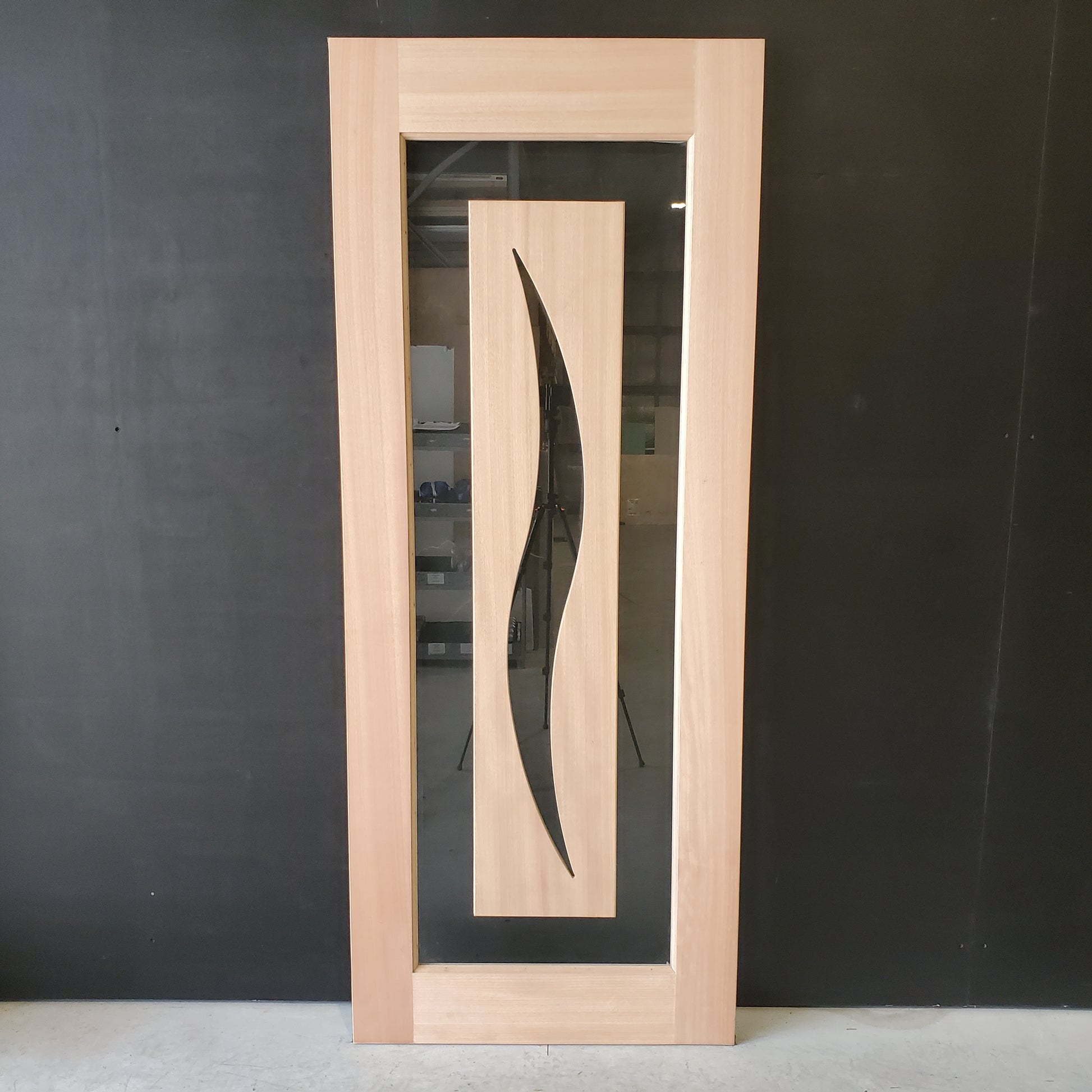 Timber Entry Door - 2040h x 820w Solid Core w/ Floating Timber 'S' Motif Panel Clear Glass *New* 40032